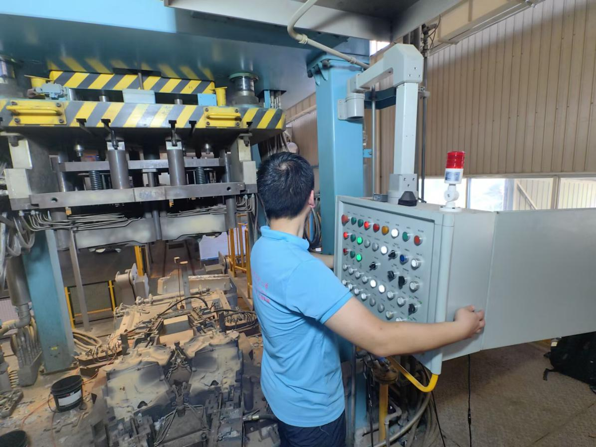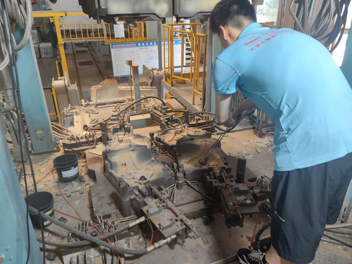 在压铸机旁,团队成员轮流上阵操作设备,亲身感受压铸的每一个具体流程。“一个小小的过滤网,对铸造件品质好坏的影响是很大的。”2023级计算机科学与技术专业3班的孙烁同学在实践中加深了对生产细节重要性的认识。