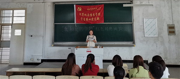 活动中,党员们朗诵了《祖国啊,我亲爱的祖国》《国旗迎风飘扬》《可爱的中国》《我的祖国》等红色经典篇目,或慷慨激昂,或沉郁顿挫,或神采飞扬,整场活动精彩纷呈,诵读者声情并茂的朗诵深深感染了在场的每一位听众,现场不时响起阵阵热烈的掌声,同学们既感受到了诗歌的魅力,又受到了一次红色文化的熏陶。全体党员合唱《我和我的祖国》,活动在嘹亮的歌声中圆满结束。