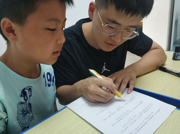 “线上+线下”课业辅导。受疫情影响,王超同学发现家乡部分教育辅导机构还没有恢复正常的工作状态。他第一时间就想到那些在学习上确实有困难的留守儿童的学习问题,于是他想针对他所在的社区的留守儿童开展课业辅导。在和队员汪嘉瑞的共同努力下,借用了当地某辅导机构的一间空教室,定期为家庭困难和因疫情影响到学习进度的中小员工进行课业辅导。