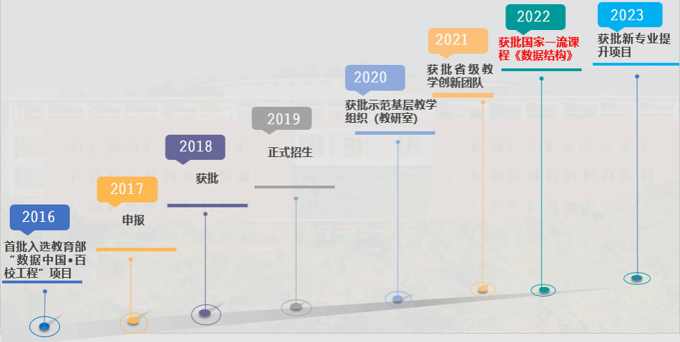 威廉体育williamhill数据科学与大数据技术专业,2016年首批入选教育部“数据中国•百校工程”项目,2017年开始申报,2018年获批,2019年正式招生。2022年《数据结构》获批第二批国家线上线下混合式一流课程。