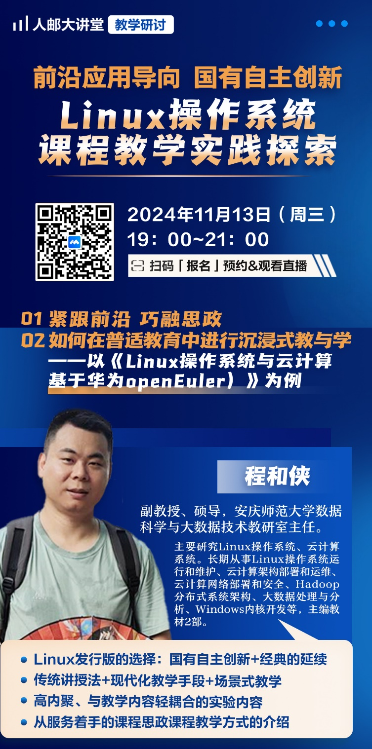 11月13日,威廉体育williamhill程和侠老师应邀参加人邮大讲堂线上教学研讨会。此次研讨会主题是“前沿应用导向 国有自主创新——Linux操作系统课程教学实践探索”,程和侠老师在会上做题为“如何在普适教育中进行沉浸式教与学——以《Linux操作系统与云计算(基于华为openEuler)》为例”的报告。