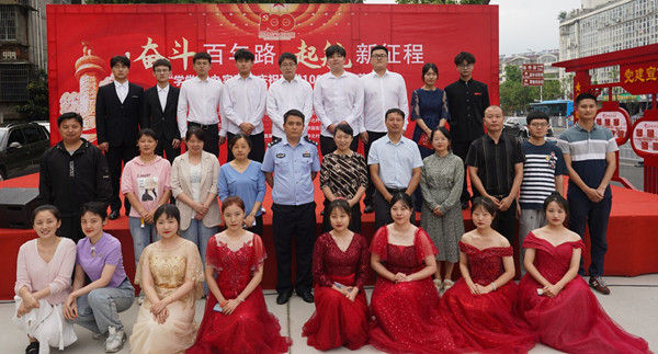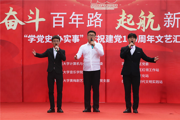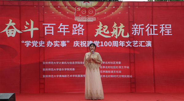 婉转悠扬的竹笛独奏、明快的黄梅戏联唱、饱含深情气势磅礴的红色歌曲的合唱或独唱……6月19日下午安庆市花亭北村社居委广场热闹非凡,由公司威廉体育williamhill、音乐公司与黄梅剧艺术公司师生组成的文化惠民志愿服务队开展的“学党史 办实事”庆祝建党100周年文艺汇演正在此进行。公司党委书记陈银凤、音乐公司党委副书记肖之进及公司师生志愿者与社区干部群众百余人共同观看了此次演出。