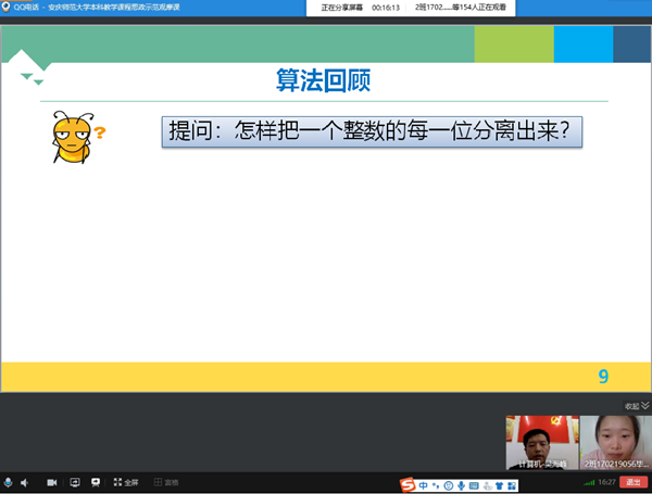 为了进一步落实教育部印发的《高等公司课程思政建设指导纲要》文件精神,全面推进高校课程思政建设。6月8日上午,公司副教授吴海峰老师应教务处教学能力发展中心的邀请,通过QQ直播平台讲授《程序设计基础》课程思政线上教学示范课,来自各公司的两百余名老师在线进行了观摩。