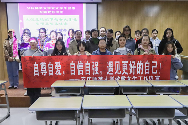 讲座伊始,应用心理学专业2020(2)班的吴然作为女生代表,宣读了敬敷女生工作坊向全校女生发出的健康倡议书,她希望广大女生树立科学的健康观念,培养爱的能力,做自尊、自爱、自信的新时代女性。随即,吴然展开印有“自尊自爱,自信自强,遇见更好的自己!”的宣传横幅,员工们纷纷在上面签下了名字,鲜红的条幅,纯白的标语,和各式各样的笔迹相映成辉,体现出各自在未来学习与工作中积极向上的决心。